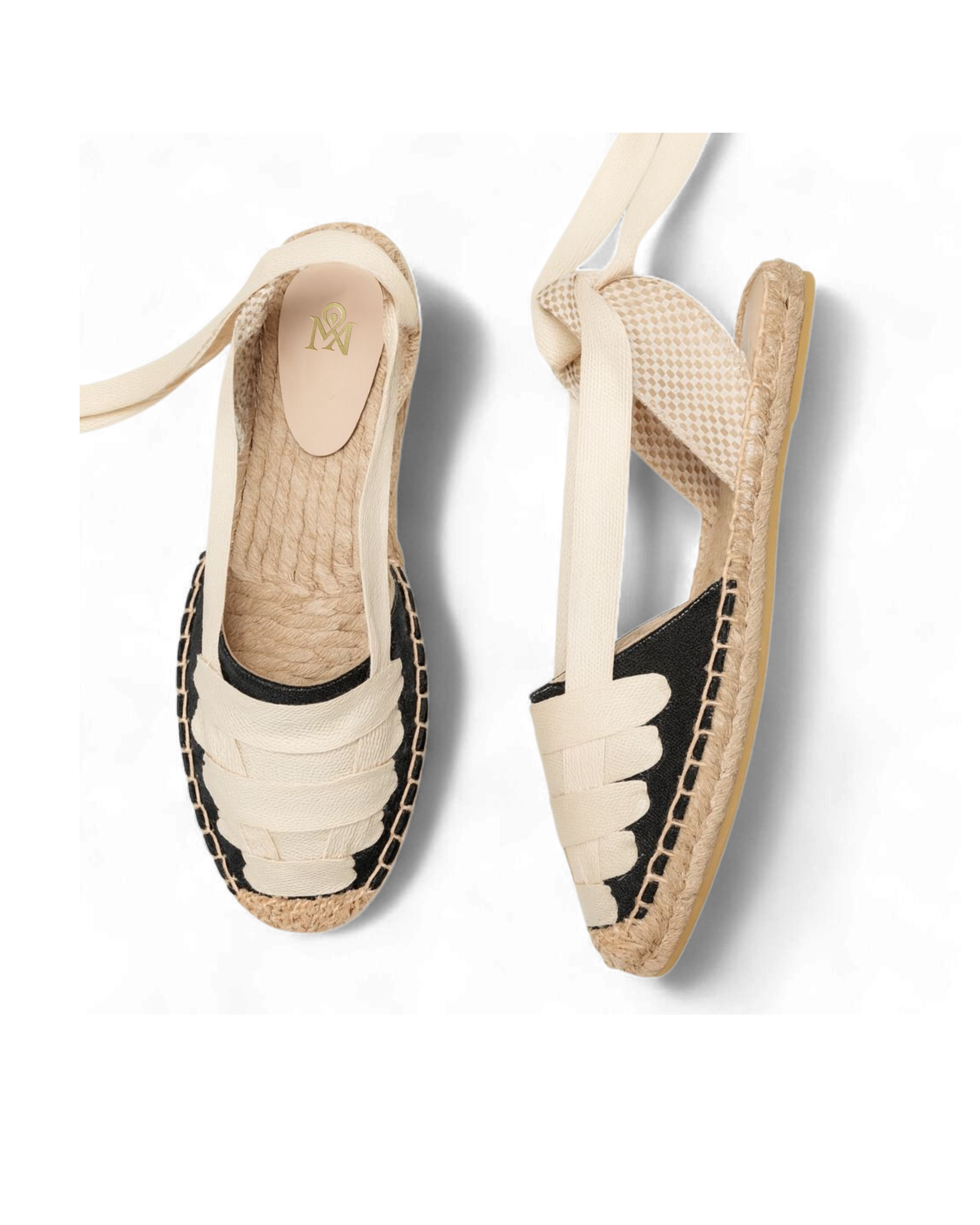 Refresh availabilityThe Ciela Wrap Espadrilles embody timeless Mediterranean charm with a modern edge. Handcrafted with natural jute soles and black canvas uppers, these sandals feature wide ivory cotton straps woven across the front for comfort and durability. The ankle tie design offers versatile stylingβwrap them high for a chic statement or low for casual elegance. Lightweight and breathable, theyβre perfect for weekend getaways, city strolls, or effortless summer dressing.